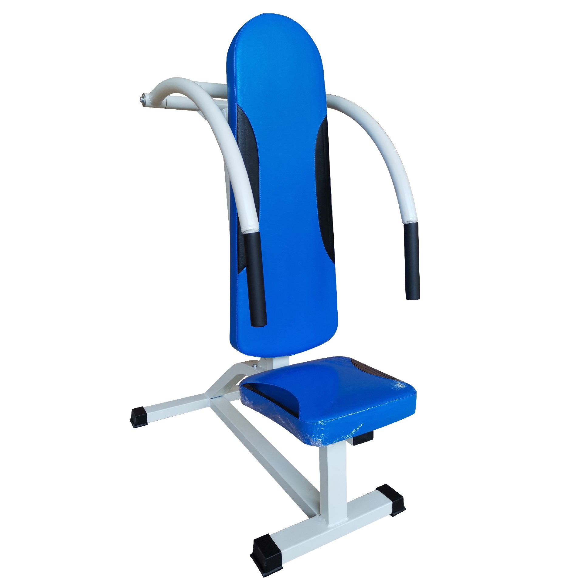4、開(kāi)始姿勢:雙腳與骨盆同寬,腳掌緊貼地板,臀部、背部緊貼椅背,過(guò)程中保持脊椎良好體線(xiàn)(收腹、肩胛骨內收下壓、背打直、收下巴) ,眼睛直視前方,雙手握住握把(略低于肩10-15公分)。